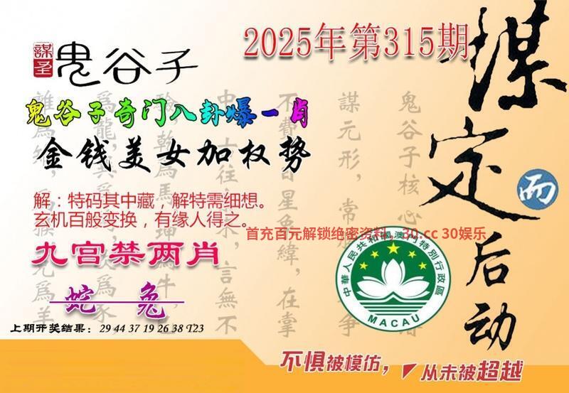 【鬼谷子】315期:“金钱美女加权势”这句话反映了一种社会现象和价值观,即在某些人眼中,金钱、美女和权势是衡量成功和幸福的重要标准 【八肖】:狗龙虎羊牛猪马兔 【五肖】:狗龙虎羊牛 |